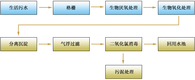 ※本工艺采用的是生物处理无剩余污泥技术,微生物把有机物和有害污染转化为空气-氮氧化和物、热量和水。因此污泥量少,减少了管理费用。