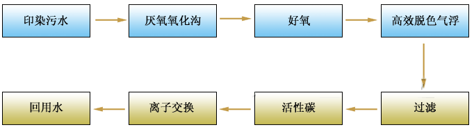 本工艺回用水,可回用至退浆、煮练、漂洗、丝光等前段工序,并与新鲜水混合用于后段工序,染布到合格的出厂标准。操作流程简便,自动化运行,后段运行费用0.6元/ m3左右,适用于目前印染废水已经达标排放的企业。加离子交换工艺后,可回用至所有工序。本工艺视具体印染厂的生产产品、染料、助剂、工艺及污水站处理工艺做相应的调整。回收产水水质